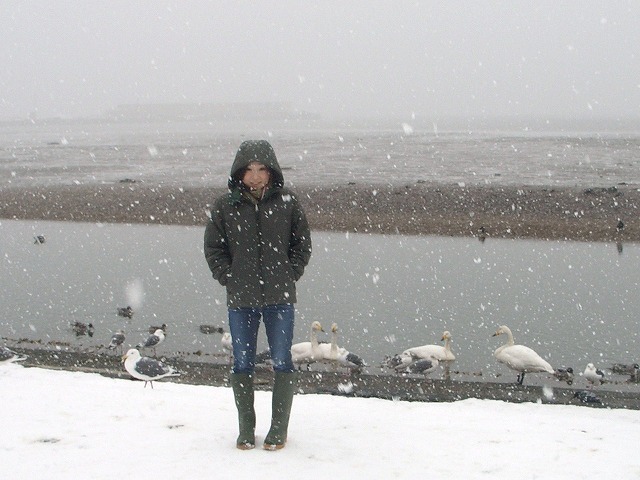 | あくる日、オプションツアーで津軽ストーブ列車に乗ろうという計画も全員の二日酔いでつぶれ、みかちゃんに津軽の白鳥の飛来地「夏泊」に案内してもらった。 |